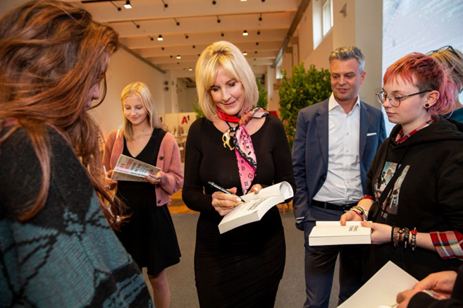 Erin Brockovich signing copies of her book “Superman`s not coming.” with A1 CEO Thomas Arnoldner and students