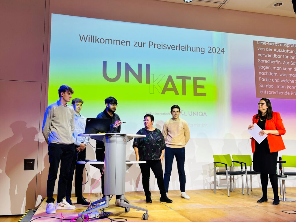 Am 17. 10. 2024 wurden 6 Schüler der Abteilung Wirtschaftsingenieure im Veranstaltungszentrum Catamaran beim Ideenwettbewerb UNIKATE für die erfolgreiche Verwirklichung eines mobilen Arbeitsplatzes für Personen mit Seheinschränkungen geehrt. Es ging darum, ein Projekt umzusetzen, das es Menschen mit Behinderung erleichtert, ihr Leben selbstbestimmt zu meistern.