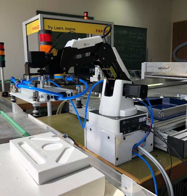 Die bestehende Roboterstraße soll um eine Pick and Place Anwendung erweitert werden. Diese bewegt das Werkstück zwischen Bearbeitungsplatz und Förderband. Es soll für zwei Fertigungszellen eine Pick and Place Anwendung aufgebaut werden. Die Unterdruckerzeugung für die Greifer muss geplant und aufgebaut werden. Weiters sollen alle Fertigungszellen um eine Ampel erweitert werden.